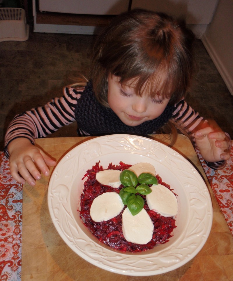 Mozzarellaen skæres i skiver og ligges oven på rødbederne.