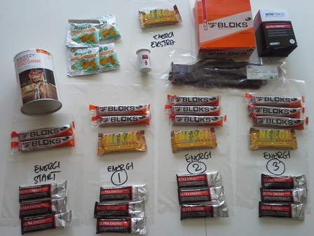 Energi og mad indtaget undervej. Havde pakket 3. poser energi hjemmefra udover det jeg havde med fra start. Poserne ville jeg så bare snuppe fra dropbag når jeg susede gennem depoterne var planen. Varmen gjorde dog at jeg kun fik konsumeret 11 af mine 12 Winforce geler. 4 af mine 10 Clif Shotblocks. Ingen af mine faste energibarer havde blandt andet supleret med Beet-it sport bar. Havde som udgangspunkt også 1½l. Energidrik i væskeblæren, men fyldte efterfølgende kun op med vand og spiste en saltsticks ca. hver anden time. I depoterne spiste jeg banan og gifler og drak det cola jeg kunne nå. Aftensmaden en lille portion tomatsuppe med pasta. Havde også beef-jerky med til når jeg blev træt af sukker men kunne ikke overskue at spise det alligevel.