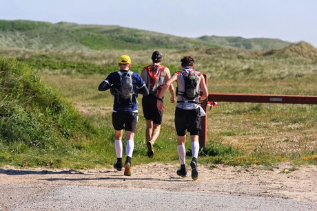 På vejen tilbage løb vi det meste af tiden alene. I starten mødte vi selvfølgelig de 50 og 100M løbere der ikke var kommet til Bulbjerg endnu. Jeg begyndte at synes det var underligt at vi ikke havde mødt Tomas Pilsborg endnu, trods det at jeg viste at han ville løbe i roligere tempo end os. Men så dukkede der en silhuet op i det fjerne der lignede Tomas. Vi mødtes og den var god nok, Tomas havde haft en lang og varm dag på stranden og i klitterne. Han lignede en der var kørt langsomt rundt over gløderne og var godt ristet. Han snakkede om at stoppe ved Bulbjerg, men tænkte han kom på bedre tanker. Men Tomas dag endte på toppen af Bulbjerg ligesom mange andre stærke mænd den dag.