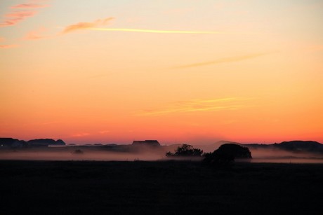 Vi ser solnedgangen mens vi løber gennemTorup Båke (Sømærke), Kaldes også Tvorup Båke ved Bøgested Rende. 4 km nord for Nørre Vorupør. Pos. 56° 59′ H: 11 m. Kl. ca. 22:15 Klaus er ikke i det romantiske hjørne og gider ikke holde hånd, så vi fortsætter bare i vores rytme mellem gang og løb mod det sidste depot i Vorupør. Det er blevet mørkt da vi kommer til Vorupør. Vi får tanket op og løber ud af byen. Men løber forkert og mens Klaus orienterer sig går jeg på potten i en grøft. Vi finder den rigtige vej ud af byen og møder nu Hans Schack og Tonni Bager som er nået op til os mens vi har fumlet rundt i Vorupør. Hans Schack ser ud til at være godt løbende, vi kommer dog ind i en god rytme igen og ligger afstand til de andre. Vi har dog hele tiden en fornemmelse af at Hans vil løbe forbi os og ser hans pandelampe fra tid til anden bag os. Mosekonen havde også været i gang og vi så elverpigerne danse mens vi løb under et låg af tåge ret syret oplevelse.
